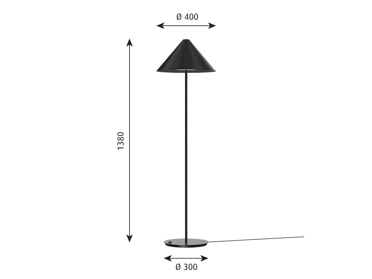 機能的な光と抑制のきいたフォルムが特徴的なカイレンシリーズ。支柱がディフューザーのデザインに変化を与え、ペンダントとは異なる幾何学的な曲線を生成しています。シェードには、雫(しずく)を連想させる湾曲したディフューザーを内蔵し、眩しさのない下向きの光を確保しています。シェード上部にある開口部からも、上方に向けて穏やかな光を届けます。支柱とベースは、円錐形のシェードと同じようにグラフィックでシンプルなデザインです。