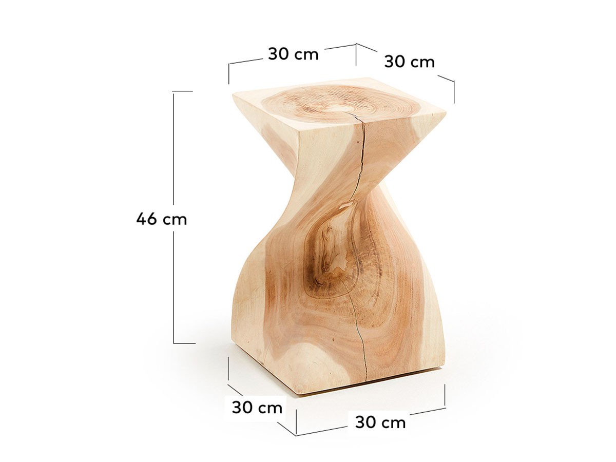 無垢材を贅沢に使用した、ユニークなフォルムが目を引くサイドテーブル。自然のままの木目や節の表情をダイレクトに感じられる、ナチュラルで温かみのある質感が魅力です。大胆に捻じれたデザインが空間に動きと個性をもたらします。