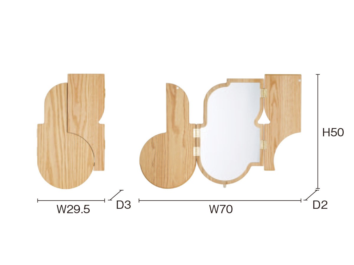 使用しないときは扉を閉じて隠せる、インテリア性の高いウォールミラー。空間にナチュラルな雰囲気を取り入れることができます。扉の手が触れる箇所には面取りを施し、使い心地と触り心地に配慮したデザインです。バストアップがちょうど映るサイズで、朝の身支度や外出前のチェックに便利です。