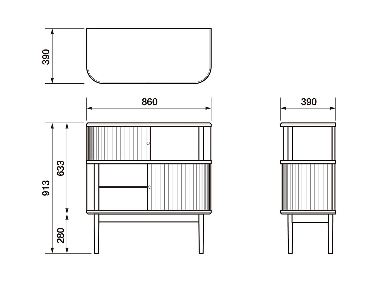 ジャバラ扉を備えたキャビネット。短冊形状のガラスが絶妙な透け感を生み出し、透明板ガラスとは異なる立体的な表情を演出。小ぶりなサイズながら、空間に特別な存在感を放ちます。ガラスをジャバラ扉として仕立てる工程には、工業機械だけでは実現できない繊細な職人技が活かされています。