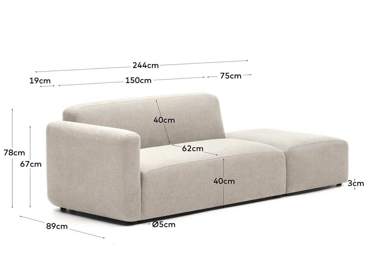 幅広いインテリアスタイルに調和する2人掛けモジュールソファ。低めの背面は視界を遮らず、圧迫感を抑えながら、空間を広々と見せる設計です。アームの左右は組立て時にお選びいただけます。