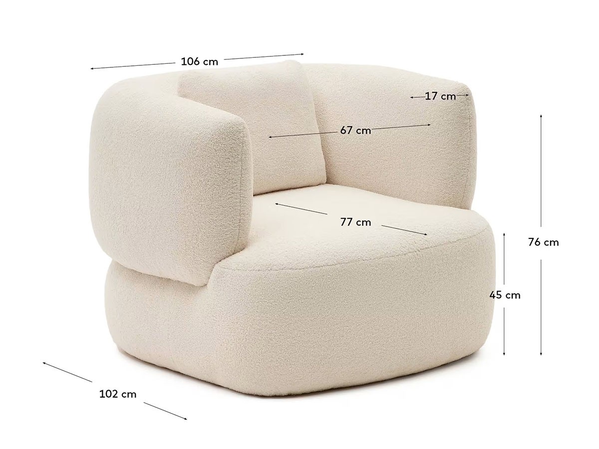 職人の手作業によって生み出された、美しい曲線のシルエットが目を引く1人掛けソファ。座面はやわらかく、腰を下ろすと身体のラインに沿ってゆっくりと馴染み、ゆったりとくつろげる座り心地です。張地にはブークレ生地を採用しており、やさしく滑らかな肌触りが特徴です。