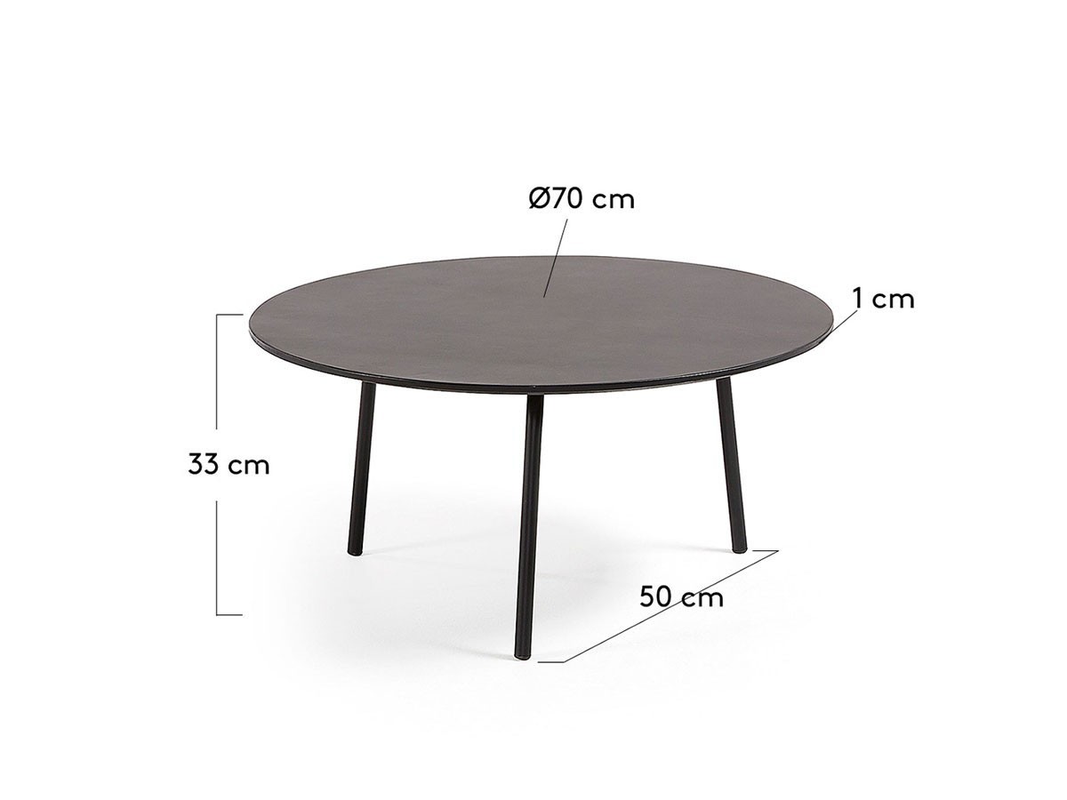 ブラック仕上げのセメントファイバー製天板が、コンテンポラリーな雰囲気を演出する円形コーヒーテーブル。スリムな3本脚が軽やかな印象を与えます。防水性に加え、傷や錆びに強い亜鉛メッキ鋼製の脚部を採用しており、耐久性にも配慮されています。屋根のある屋外でも使用可能で、幅広いシーンで活躍します。