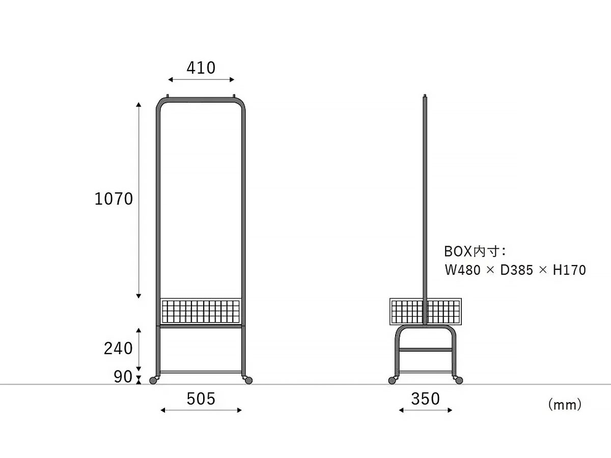 コンパクトなサイズ設計で、玄関やワンルームなど限られたスペースでも活躍。キャスター付きで移動もスムーズに行え、バスケットは着脱可能です。