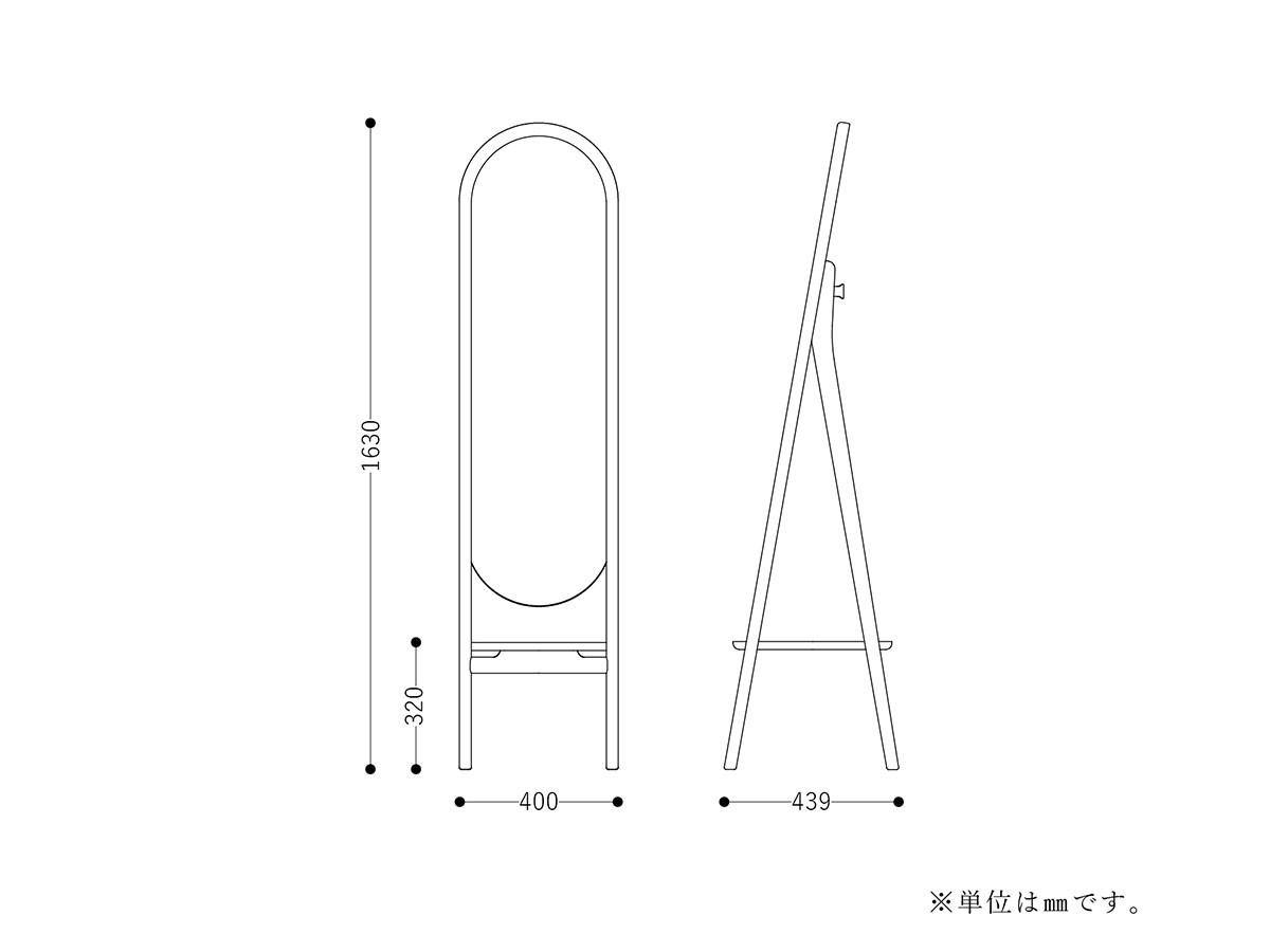 木目の美しいオーク無垢材を贅沢に使用し、天然木の風合いを存分に楽しめるスタンドミラー。丸みを帯びたフォルムが空間に馴染み、日々の暮らしをやさしく彩ります。背面にはフックを備え、トートバッグや帽子などを掛けることができます。下部には棚板を備えており、身支度の際に小物などを置ける便利さも魅力です。