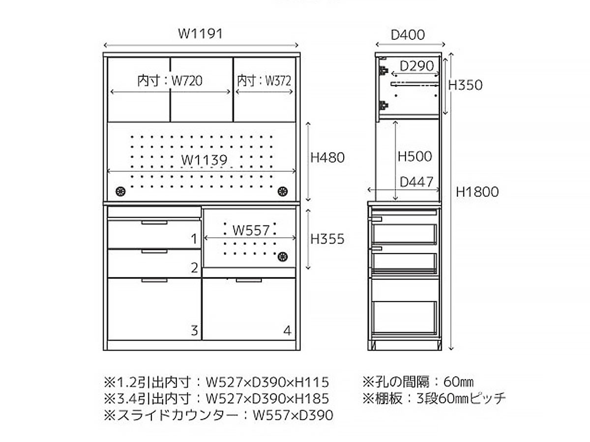 大小4杯の引出しには、カトラリーやキッチンツールなどの小物から、調味料や鍋といった大きなアイテムまで、用途に応じてすっきりと収納できます。フルオープンレール式を採用しており、開閉がスムーズで、奥までしっかり引き出せるため、中身の確認や出し入れも快適に行えます。