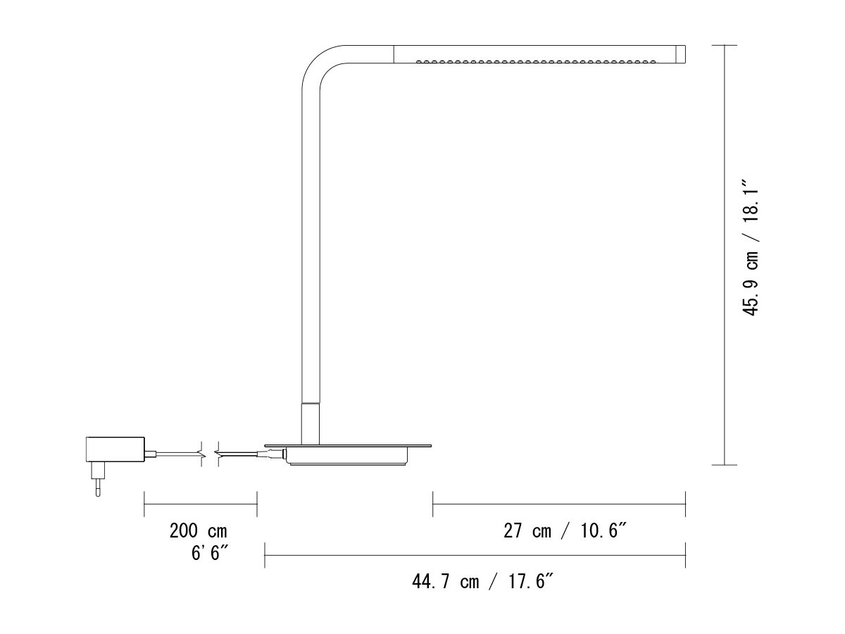 ミニマルで洗練されたフォルムと機能性が融合したデスクライト。ライトモジュールとステムはそれぞれ360度回転し、必要な場所へ自在に光を向けることができます。ベース部分のボタンで無段階調光が可能で、点灯時にはライトモジュールに開いた小さな穴から、印象的な光の模様が浮かび上がります。